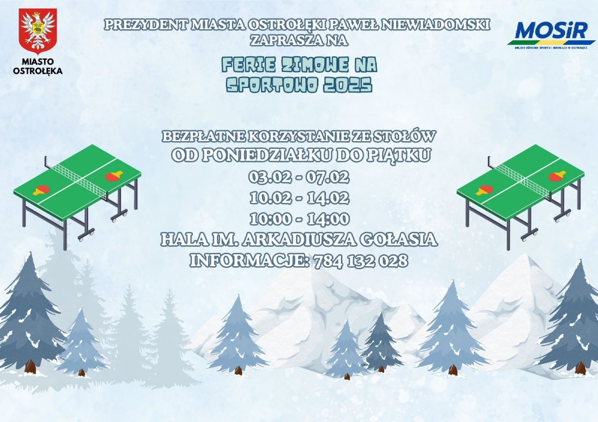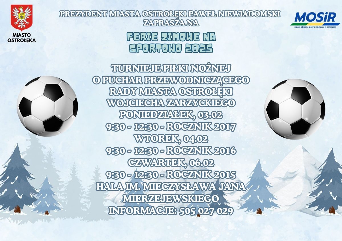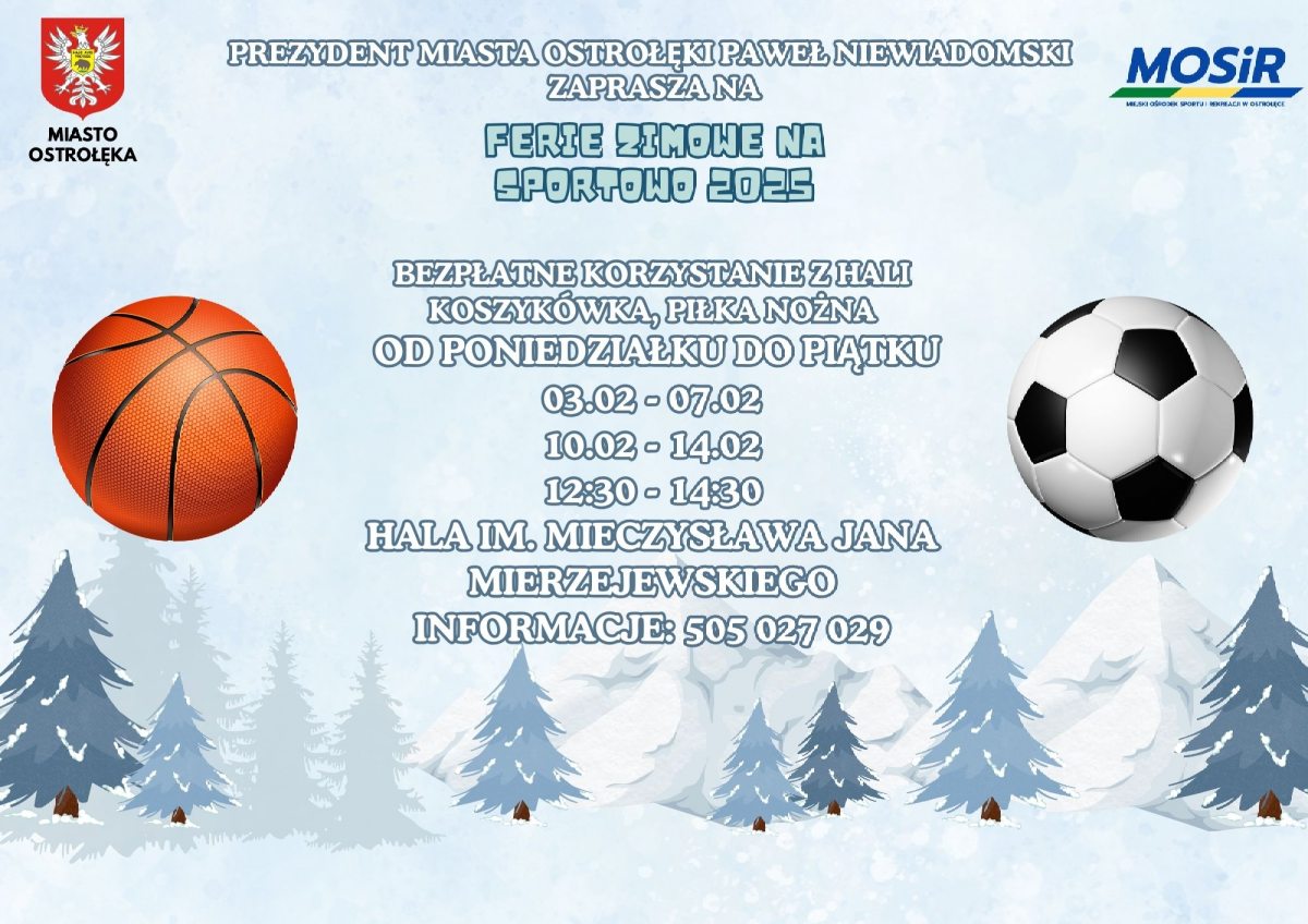 Ferie zimowe w województwie mazowieckim zbliżają się wielkimi krokami. Jak co roku młodzi mieszkańcy naszego miasta będą mogli aktywnie spędzić ten czas korzystając z cyklu bezpłatnych zajęć i turniejów w ramach ,,Ferii zimowych na sportowo 2025”. Prezydent Miasta Ostrołęki Paweł Niewiadomski zaprasza dzieci i młodzież do skorzystania z szeregu form aktywności fizycznej.